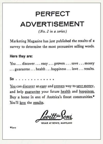 Een recent artikel van Hubspot toont aan wat ik bedoel met die ‘buzzword-cyclus’: in de loop van de geschiedenis is de lijst met ‘beste marketingwoorden’ telkens veranderd. In de jaren ’60 ontdekten onderzoekers dat er 10 woorden waren die in reclame erg goed werkte. Het bedrijf Levitt & Sons maakte er meteen een advertentie van, zie het plaatje hieronder: