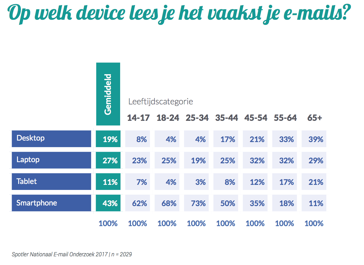 Deze e-mails worden het meest geopend op smartphones, ondanks dat de respondenten van 55 jaar en ouder hun e-mails het liefst openen op een desktop of laptop.