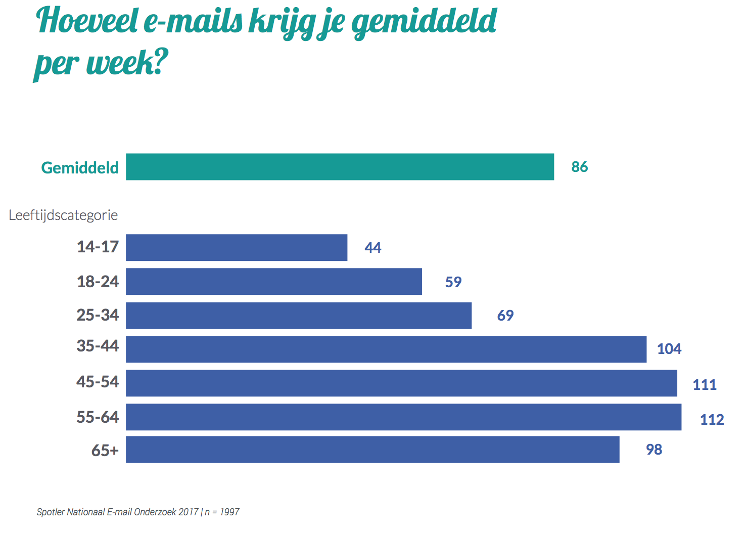 Gemiddeld ontvangen de respondenten 86 e-mails per week. Het zijn vooral de gebruikers van 35 jaar en ouder die (ruim) meer dan het gemiddelde aantal e-mails per week ontvangen. De jongste categorie (14 tot 17 jaar) ontvangen de minste e-mails per week: slechts 44.