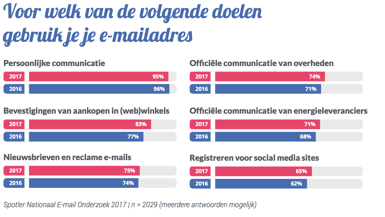 E-mail is en blijft een belangrijk communicatiekanaal en net als vorig jaar wordt het vooral gebruikt voor persoonlijke communicatie (95 procent). Ook worden e-mailadressen vooral gebruikt voor bevestigingen van aankopen in webwinkels (83 procent) en nieuwsbrieven en voor reclame (75 procent).