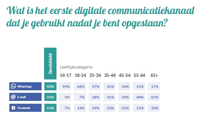 Leeftijd blijkt inderdaad een rol te spelen. Voor 55-64-jarigen en voor 65-plussers is e-mail ’s ochtends het eerste geraadpleegde online communicatiekanaal. En Nederlanders van 45-54-jaar zijn in dubio: WhatsApp en e-mail delen de eerste plek met een voorkeur van 34 procent.