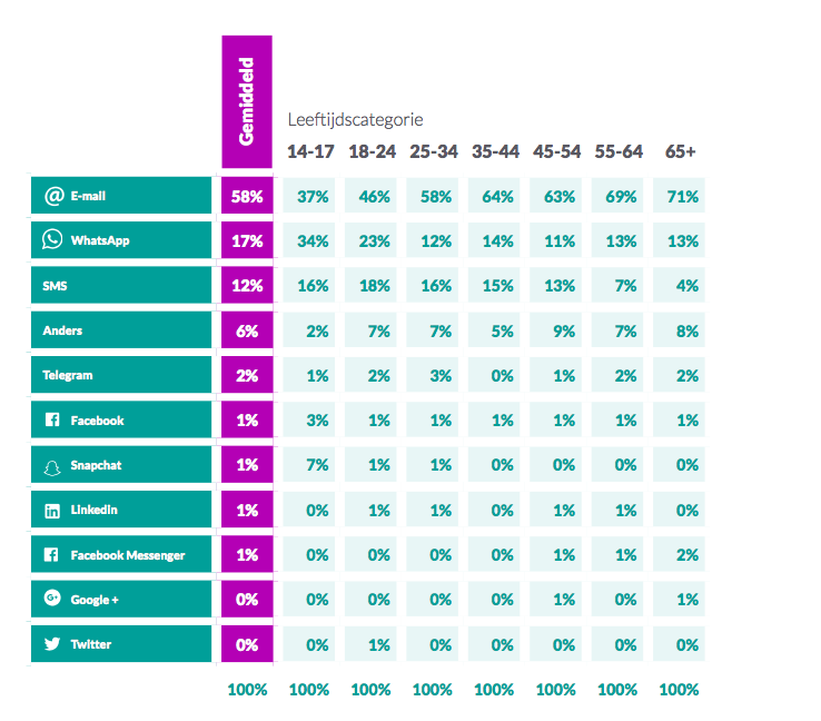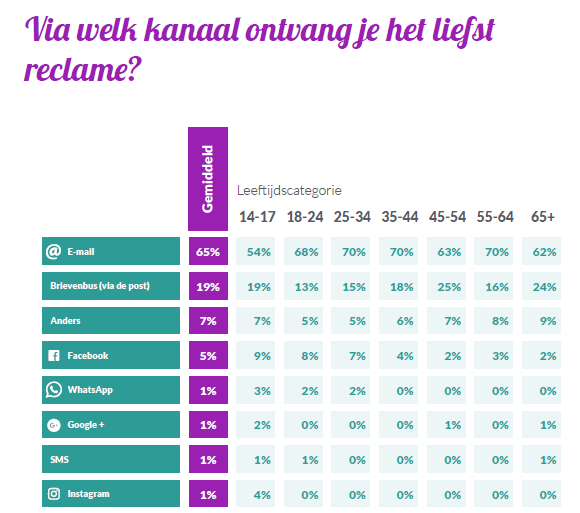 Twitter, Snapchat en LinkedIn zijn uiteraard ook onderzocht en die platforms noteren een voorkeur voor de ontvangst van reclame van 0 procent. Reclame via social is een no-go. Toch zegt meer dan 60 procent van de Nederlanders in de leeftijd van 25 tot 45 dat zij maandelijks online aankopen doen. Waarom willen zij hiervoor geen reclame ontvangen via social media? Waarom is e-mail hiervoor het aangewezen kanaal?