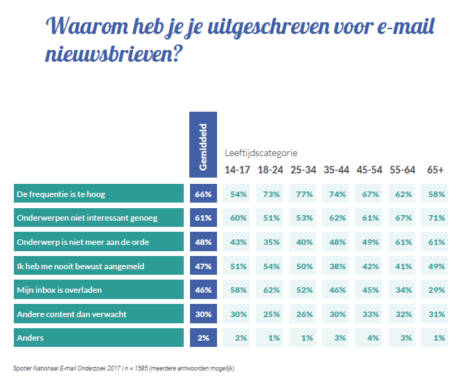 Zo blijkt dat voor 18-24-jarigen ‘de frequentie is te hoog’ een belangrijke reden (73 procent) is om zich uit te schrijven voor e-mailnieuwsbrieven. Voor 65-plussers scoort deze reden slechts 58 procent.