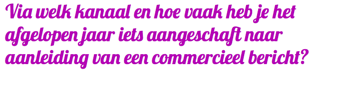 Dat Nederlanders hun social media niet willen gebruiken voor e-commerce, wordt ook bevestigd door de vraag via welk kanaal en hoe vaak wij naar aanleiding van een commercieel bericht iets aanschaffen. Ook bij deze vraag bestaat de grootste voorkeur voor e-mail. Alleen Facebook weet de Nederlander zo nu en dan te verleiden tot een online aankoop. Dat geldt voor gemiddeld 14% van de Nederlanders die eenmalig iets hebben aangeschaft via Facebook en voor 16% die zich vaker door een commercieel bericht op Facebook laat verleiden. Toch blijft e-mail met percentages als 58% vaker dan één keer iets aangeschaft de grote koploper.