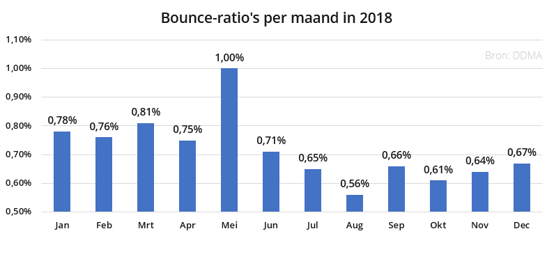 Het is niemand ontgaan dat op 25 mei 2018 de AVG van kracht is geworden – de nieuwe Europese wet voor de bescherming van persoonsgegevens. Voor veel organisaties was dit reden om hun marketingdata en -activiteiten nog eens goed onder de loep te nemen en waar nodig passende maatregelen te treffen. Een aantal bedrijven hebben zelfs re-opt-in campagnes verstuurd, omdat ze te veel twijfels hadden over de geldigheid van de opt-ins. Dat verklaart de duidelijke piek van het aantal bounces in mei 2018. Een uitzonderlijk hoog percentage van 1 procent kwam in mei niet in de inbox terecht!