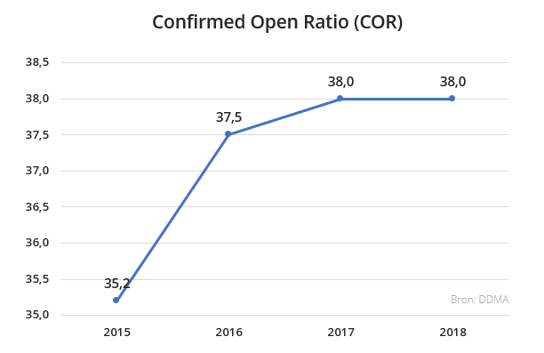 De resultaten laten zien dat de effectiviteit van e-mail als marketingkanaal nog altijd hoog is. De confirmed open ratio (COR) is met 38 procent gelijk gebleven aan het jaar ervoor.