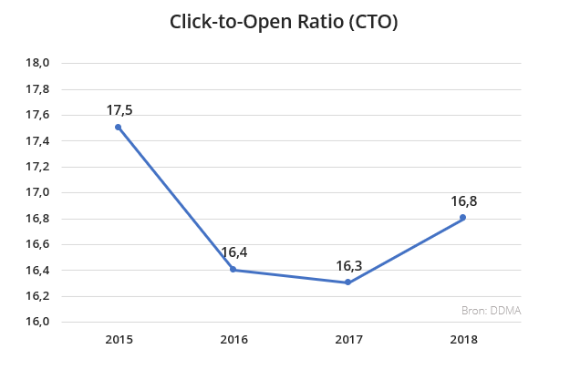 De click-to-open ratio (CTO) laat een duidelijke positieve trend zien met een gemiddelde van 16,4 procent in 2017 naar 16,8 procent in 2018.