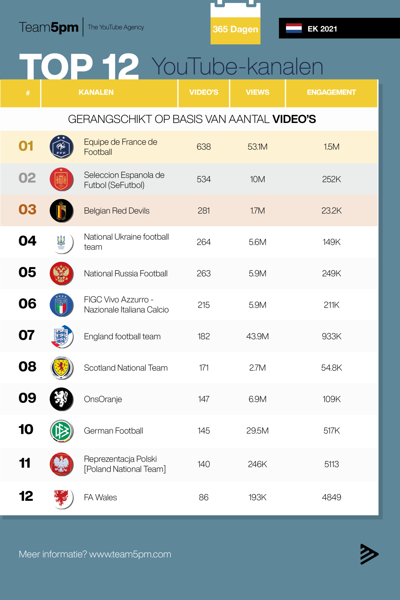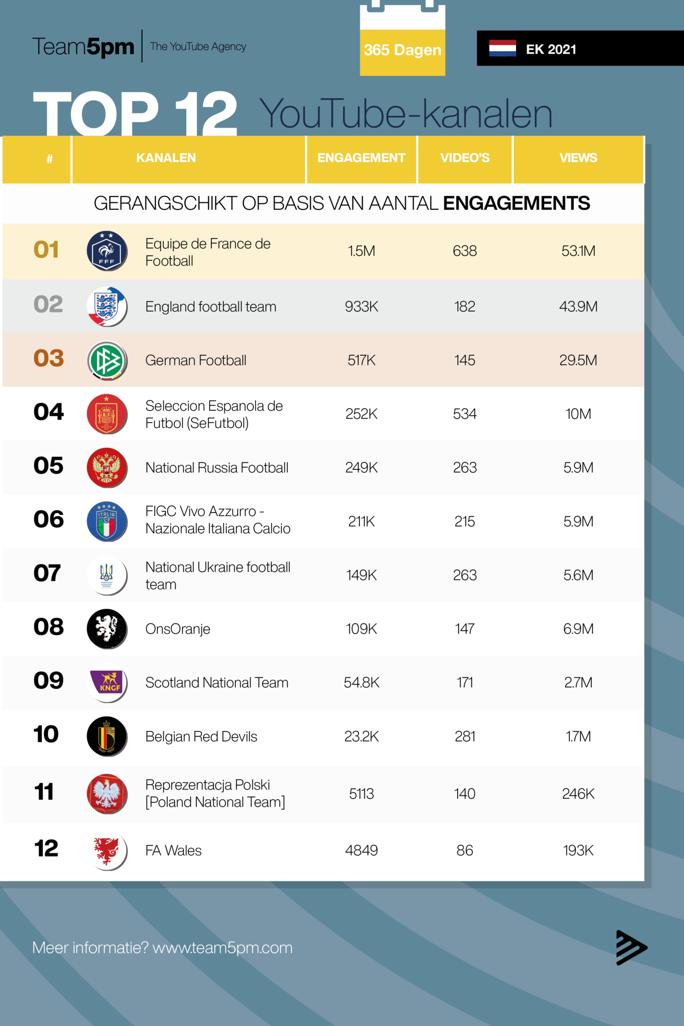 Hoewel Frankrijk in 2016 het EK niet won, zijn ze op YouTube wel de duidelijke winnaar van dit jaar. Dit team heeft het potentieel van YouTube optimaal benut. Met 638 geüploade video’s genereerde het Franse team meer dan 53 miljoen views en 1,5 miljoen engagements in de afgelopen 365 dagen. De vijf minuten durende samenvatting van de 7:1 wedstrijd tegen Oekraïne haalde maar liefst 1,9 miljoen views en is overduidelijk de video met de meeste views. De video die met 45.900 de meeste engagements haalde, gaat over een bezoek van de spelers aan Clairefontaine, het medisch centrum van FIFA.