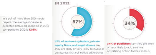 De kracht van native advertising gaat niet onopgemerkt aan adverteerders, uitgevers én investeerders voorbij. Dat blijkt onder meer uit cijfers die bijeen werden gebracht door Solve Media and Column Five. Zo is de verwachting dat de uitgaven aan native advertising in 2013 met 12,6 procent zal stijgen ten opzichte van 2012. 34 procent van de uitgevers geeft aan de mogelijkheid tot native advertising waarschijnlijk toe te gaan voegen aan hun menukaart voor adverteerders. Maar liefst 57 procent van de ondervraagde geldschieters en investeerders gaf aan het wel te zien zitten om te investeren in bedrijven die native advertising verkopen.