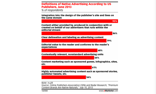 Dergelijke resultaten stemmen optimistisch, maar leiden ook tot een behoefte aan een goede afbakening van native advertising als marketingkanaal. Daarom heeft OPA (Online Publishers Association) recent in kaart gebracht wat de visie van haar leden is op native advertising. Integratie in het design van de website van de publisher en content die in samenwerking met de adverteerder is ontwikkeld en meegaat in de reguliere redactiestroom worden als belangrijkste kenmerken genoemd. 4 van de 5 uitgevers vinden het ook belangrijk dat de sponsored content wel duidelijk als zodanig gelabeld wordt.