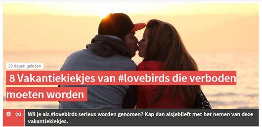 Ook in eigen land zien we steeds meer initiatieven op het gebied van native advertising. Twee voorbeelden van platforms die we bij Adfactor in ons portfolio hebben zijn Upcoming.nl en Prankster.nl. Prankster (dat onlangs nog onder de aandacht kwam op Marketingfacts) wordt dagelijks aangevuld met grappige, gemakkelijk te liken en delen filmpjes, foto’s en korte content. De content op Upcoming bestaat hoofdzakelijk uit humoristische listicles, zoals 15 Ontzettend goede marketingstunts. Bezoekers van deze sites willen lachen en verrast worden. Of content commercieel of redactioneel is maakt voor de beleving weinig uit. Een recent voorbeeld van native advertising op Upcoming is 8 Vakantiekiekjes van #lovebirds die verboden moeten worden van contentpartner Vodafone.