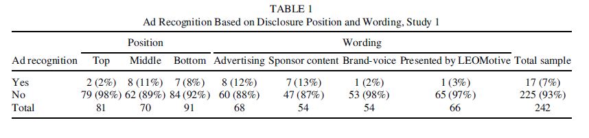 De kans dat mensen de disclosure wel zien en herinneren is het grootst als deze in het midden of onderaan het artikel is geplaatst. Deze conclusie is nogal tegenstrijdig aan de regels en adviezen die er zijn: de Amerikaanse FTC beveelt namelijk aan dat een disclosure direct vooraf aan de advertentie geplaatst moet worden of in de linkerbovenhoek van het artikel.