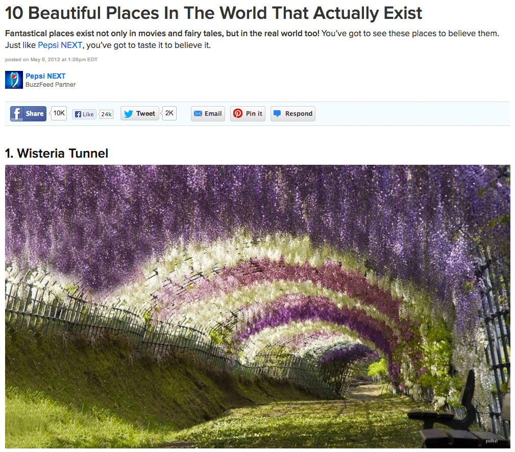 De populaire Amerikaanse nieuwssite Buzzfeed, dat geen bannerposities kent en volledig drijft op native advertising, werkt dan ook nauw samen met adverteerders bij het maken van campagnes, bestaande uit artikelen met virale content als 20 People That Are Doing It Wrong, 12 Helpdesk Tickets The Cat IT Department Is Working On en 15 of the Dirtiest Pictures on the Internet. De link tussen de content en de adverteerder is lang niet altijd heel direct of helder, zoals in het geval van het sterk virale 25 Places That Look Not Normal, But Are Actually Real, gesponsord door Mini, en 10 Beautiful Places In The World That Actually Exist, gesponsord door Pepsi Next. Merken lijken vooral ook te willen meevaren op het virale succes van de content.