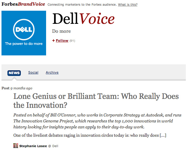 Forbes gaat zelfs nog een stap verder. Met hun AdVoice-programma stellen zij hun website open voor rechtstreekse, ongeredigeerde bijdragen van merken. Merken als Dell en NetApp maken al gebruik van deze dienst.