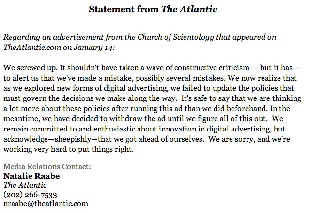 Het voordeel van de aanpak van Forbes is dat er geen – of in ieder geval veel minder – kans bestaat op verwarring tussen redactionele en commerciële content dan bij de aanpak van The Atlantic, dat in januari van dit jaar een flinke rel veroorzaakte met een native advertisement voor de Church of Scientology. Het enige zichtbare verschil met reguliere artikelen was een relatief kleine gele balk met de tekst “sponsored content” erin. Voor veel mensen bleek dit onderscheid te klein en er ontstond een flinke rel over het stuk, niet in de laatste plaats vanwege de discutabele afzender. The Atlantic gaf toe fout te zitten, verwijderde de post en verving deze door een excuusbericht.