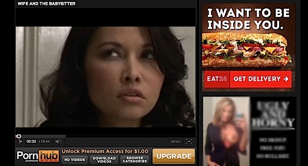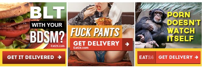 Natuurlijk kan het ook op het web. Boer haalt het voorbeeld aan van Eat24, dat z’n maaltijdbezorgservice promootte via pornosites. Daarbij speelde het met hun boodschappen slim in op de context met teksten als “I want to be inside of you” en “Eat me“.