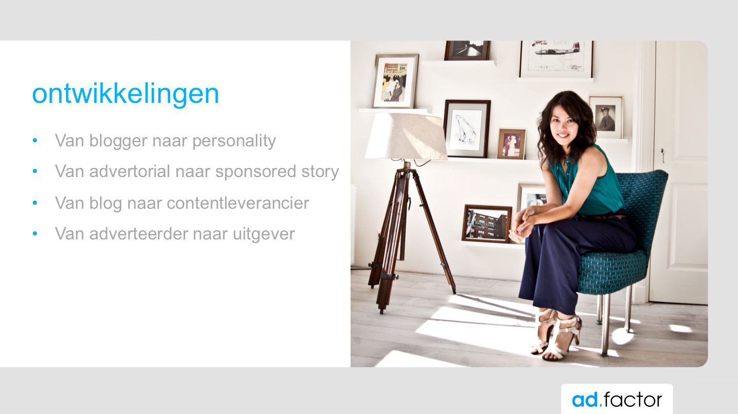 Adfactor was in 2005 de eerste exploitant voor blogs (red.: even een disclaimer: Adfactor werkt ook samen met Marketingfacts). Juist blogs hebben het niet altijd op de traditionele advertising: “Wij willen geld verdienen met adverteerders, maar we willen geen advertenties.” Zo vroeg bijvoorbeeld Retecool [http://retecool.com/] de vrijheid om zelf iets te doen voor een adverteerder.