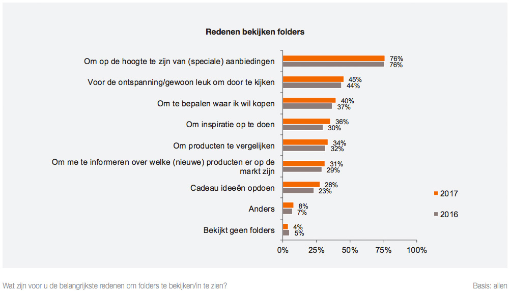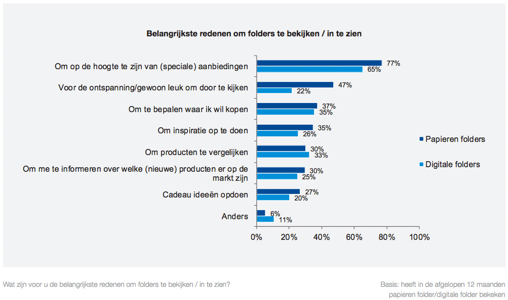 Waarom ze dat doen? Hé, we zijn Hollanders, dus voor de aanbiedingen natuurlijk! Voor 76 procent van de mensen is dat een reden de folder te raadplegen. Daarnaast zijn ontspanning, het bepalen waar te kopen en inspiratie belangrijke motieven.