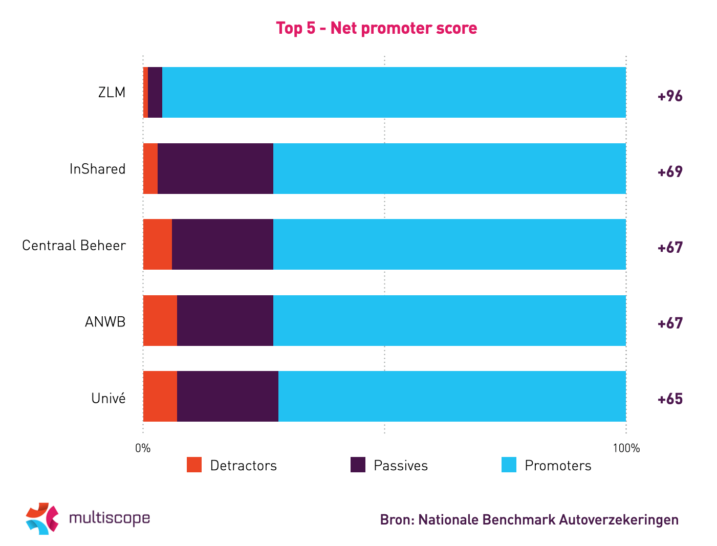 Onder de ruim 5.200 ondervraagde Nederlanders scoort ZLM met een NPS van +96 het hoogste. InShared volgt op enige afstand met een score van +69. De NPS van zowel Centraal Beheer als ANWB is +67. Univé maakt de top vijf compleet (+65). Hoewel alle autoverzekeraars een positieve score hebben, krijgt De Goudse de laagste NPS (+15).