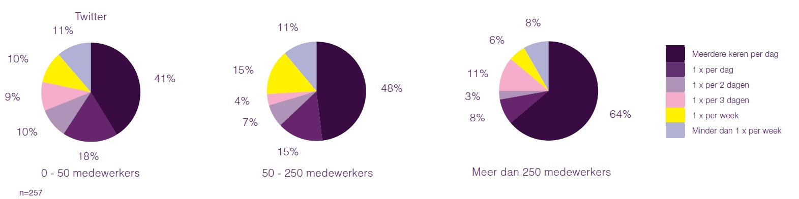 Wanneer we het gebruik van de gemeten social media kanalen tegen elkaar afzetten is Twitter met afstand het meest intensief gebruikte kanaal. Voornamelijk door grote bedrijven wordt Twitter meerdere malen per dag ingezet om informatie te zenden of interactie aan te gaan.