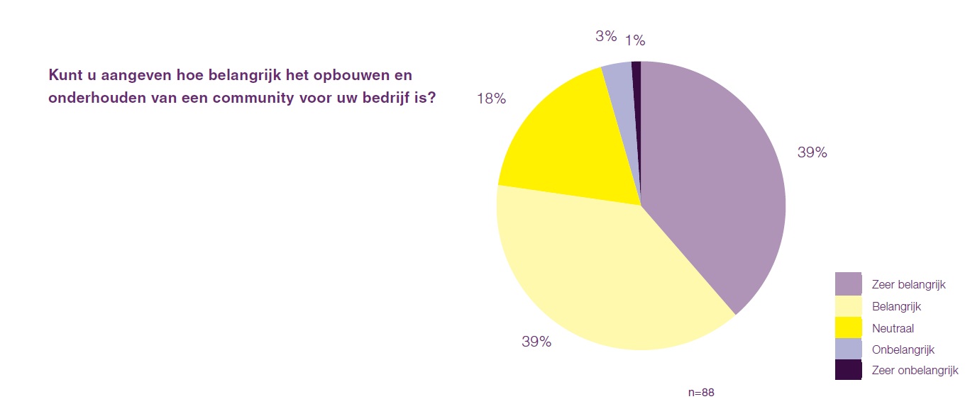 De respondenten zien duidelijk het belang van het opbouwen en onderhouden van een community. Een grote meerderheid (77%) geeft aan dat een community een belangrijk tot zeer belangrijk onderdeel uitmaakt van het bedrijf. Een goede en logische ontwikkeling gezien de transformatie van zenden naar interactie. Naarmate bedrijven groter worden groeit het belang van een community sterk. Maar liefst 57% van de grote bedrijven geeft aan dat een community een zeer belangrijke rol speelt. Overige onderlinge resultaten tussen de verschillende bedrijfsgroottes zijn aanwezig en terug te vinden in het document.