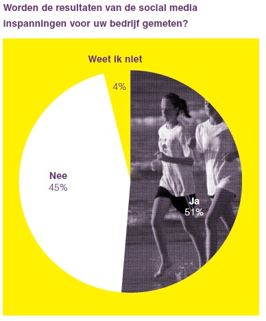 Met 51% geeft net iets meer dan de helft van de respondenten aan dat zij de resultaten van de social media inspanningen meten. In vergelijking met vorig jaar zien we een kleine stijging van ruim 5%. Gezien het stadium waarin social media verkeert hadden we een iets grotere toename verwacht. 49% geeft aan de resultaten niet te meten en de overige 4% weet niet of de social media inspanningen gemeten worden. De bedrijven die meten geven over het algemeen aan dat de resultaten zoals verwacht zijn. KPI’s die door het bedrijfsleven worden gemeten zijn o.a.: het aantal volgers en traffic naar de website.
