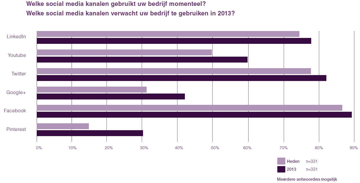 Met een inzet van 87% is Facebook op dit moment het meest populaire social media kanaal, terwijl deze plek bij het voorgaand onderzoek nog door Twitter werd ingevuld. Facebook wordt wel op de voet gevolgd door Twitter (78%) en LinkedIn (75%). De vierde plaats wordt ingevuld door YouTube met een inzet van 50%. De grootste absolute stijgers zijn Pinterest (+15%), Google+ (+11%), Youtube (+10%). Relatief gezien komt Instagram als winnaar uit de bus. Zij verdubbelen naar verwachting het gebruik in 2013.