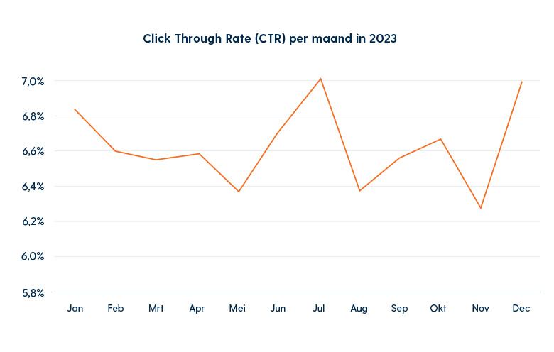 Mailcampagnes die in juli 2023 werden verstuurd scoorden een CTR van 7,02% en de campagnes van december 7,01%. En dat is in beide gevallen hoger dan het algemene gemiddelde van 6,62%. Ook als je het aantal kliks vergelijkt met het aantal opens (Click To Open Rate), dan scoort juli goed. De CTR-cijfers per maand: