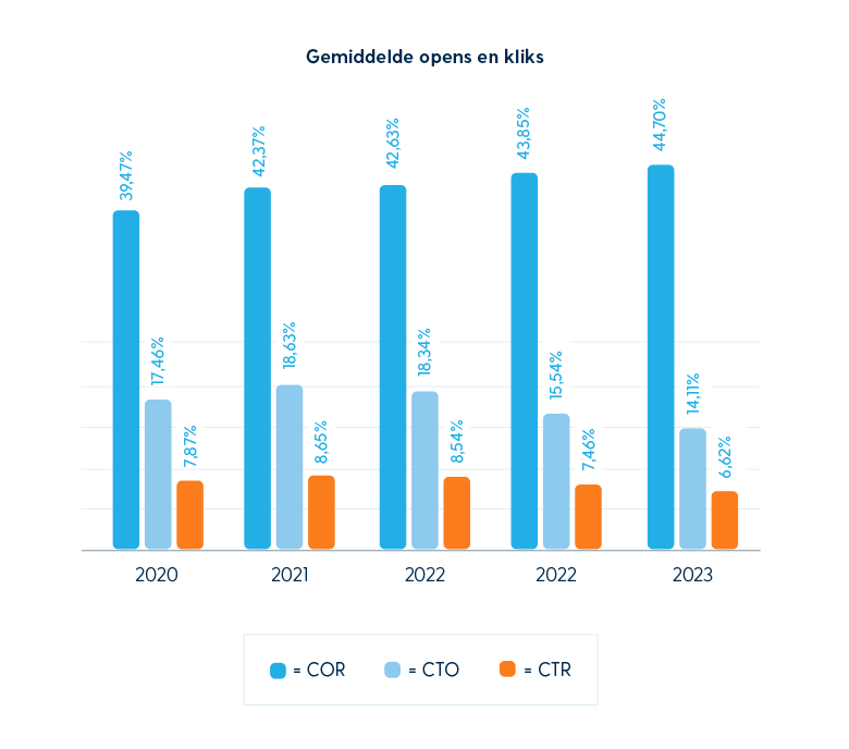 De benchmark geeft niet alleen een overzicht van de e-maildata van 2023, maar je kunt ook vergelijkingen maken met eerdere jaren. Kijk je bijvoorbeeld naar de opens sinds 2019, dan kun je concluderen dat deze ratio redelijk stabiel blijft. Er is hooguit een kleine stijging te zien van 39,74% naar 44,70%.