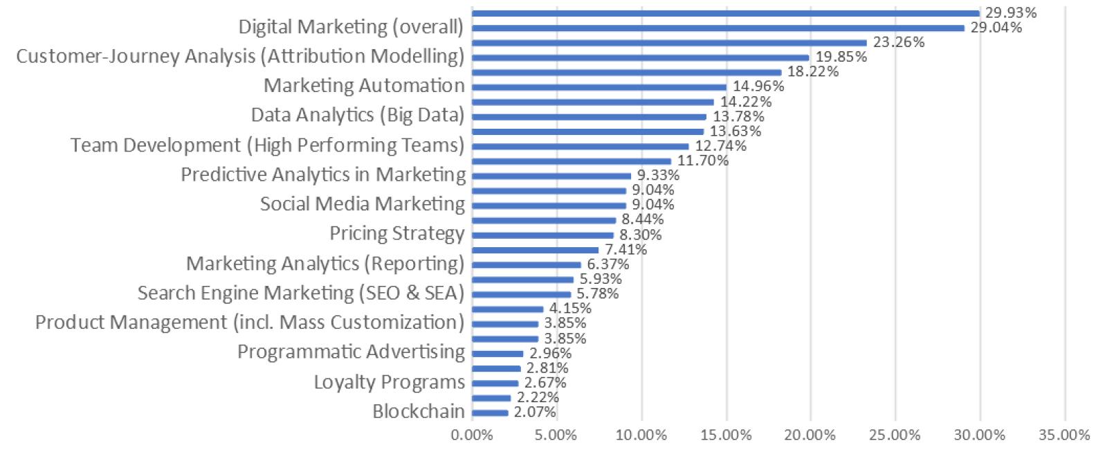 Er bungelen trouwens ook wat bijzondere uitkomsten aan de onderkant van de statistieken. Zo heeft de toepassing van blockchain voor marketing wel afgedaan als next big thing, mogen de loyaltyprogramma’s in de mottenballen en geloven de bestuurders het wel even met slimme assistenten en speakers. Dat laatste is opmerkelijk met een onderzoekspopulatie van veel Duitssprekenden, want Amazon’s Alexa spreekt toch al een paar jaar Duits, en gelet op de achtergrond van de onderzoekspopulatie mag je verwachten dat daar al wat mee geëxperimenteerd is. Thuis. Waar Herr Dokter zijn nachten slapeloos doorwaakt, denkend aan de customer journey.