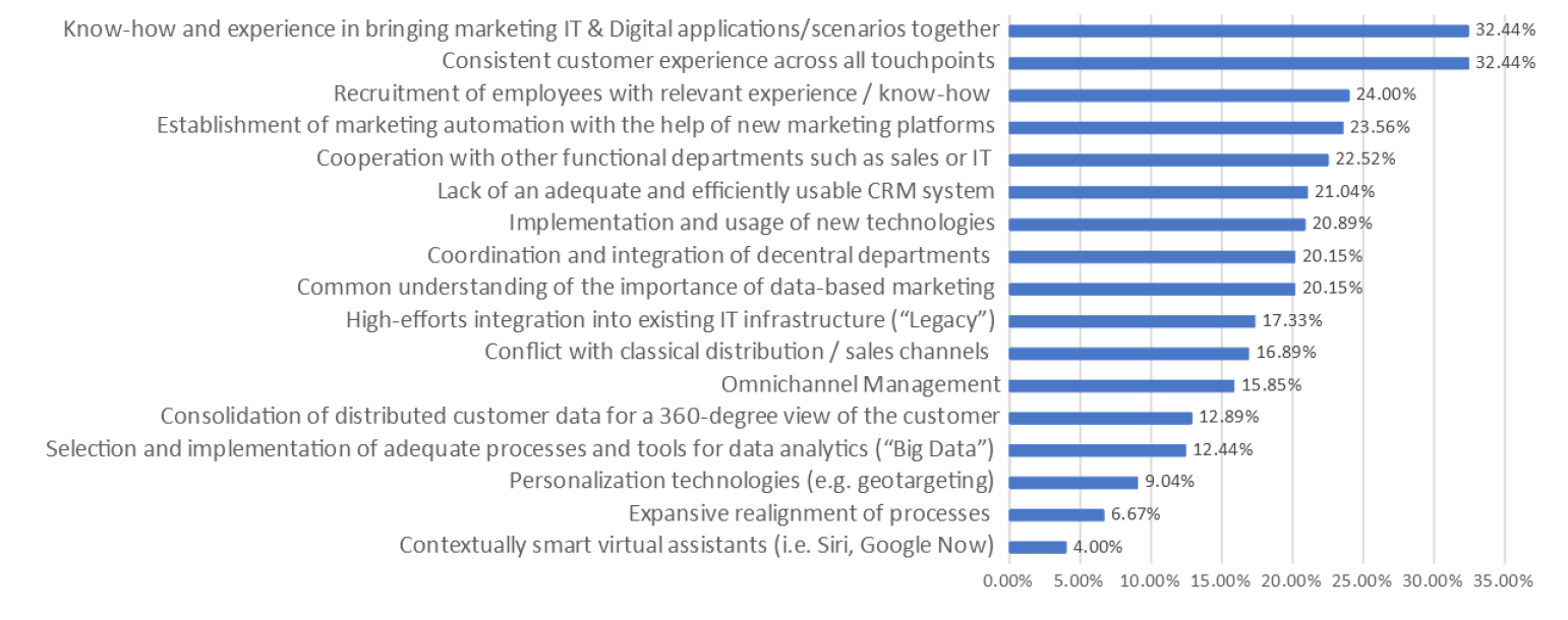 Als eerste wordt daarbij de integratie van martech met de overige IT aangehaald, met name het gebrek aan kennis en ervaring op dat terrein. Deze kluif wordt weer gevolgd door die touchpoints en vooral de consistente klantervaring over al die momenten van contact. Kennelijk wil dat nog niet zo lukken. Wie door de oogharen kijkt, ziet dat de marketing-eindbaas eigenlijk twee grote problemen heeft: ervaring, kennis en ‘gewoon’ goede mensen voor de technische skills aan de ene kant. Het optuigen van teams ook om die skills in onder te brengen. Integratie, systemen, platformen en zelfs ‘common understanding of the importance of database-marketing’ aan de andere. Specifiek voor Nederland geldt dan nog dat “Cooperation with other functional departments” (for example the sales or IT department) wordt genoemd. Daarbij schort het niet aan de effectiviteit van de verschillende ’tools’, maar eerder aan de geschikheid ervan in combinatie met al aanwezige organisatiestructuren, processen en systemen.