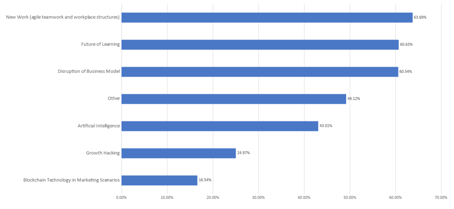 De onderzoekers gingen grondig te werk en voerden ook nog 28 diepte-interviews op basis van de uitkomsten. Feitelijk zijn aan de deelnemers twee fundamentele vragen voorgelegd: Wat zijn de ‘most important issues in 2019’, gevolgd door de vraag wat zij beschouwen als de grootste uitdaging die de agenda voor de komende maanden gaat bepalen. Voor de goede orde: dat is in de boardroom. Het gaat niet over de uitvoering van marketing, maar echt om marketing als strategische functie om het bedrijf te brengen waar het naartoe wil. Om die reden liep er een derde vraag mee, die meer in het algemeen informeerde naar management-trends.