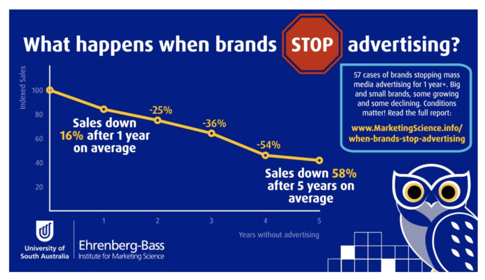 Met dank aan Screenforce deze week een aardig onderzoek van Byron Sharp et all. Wanneer merken een jaar of langer niet adverteren dan dalen de verkopen steeds meer in de erop volgende jaren. Gemiddeld is de daling na een jaar 16 procent en na twee jaar 25 procent. De conclusie van Byron Sharp en zijn medeauteurs is dat een merk waarvoor geen reclame meer wordt gemaakt lijkt op een vliegtuig zonder motor. De verkopen voor de meeste merken gaan omlaag en deze daling wordt steeds groter naarmate het merk langer stopt met adverteren. De onderzoeksresultaten maken duidelijk dat stoppen met adverteren, hoe aantrekkelijk soms ook vanwege de kortetermijnverhoging van de winstmarge, het risico met zich meebrengt dat de merkverkopen dalen. De bekendheid van het merk, de ‘mental availability’, verdwijnt zonder een voortdurende update van reclamecontacten. Om je marktaandeel (SOM) te verdedigen is een vergelijkbare share of voice (SOV) qua reclamebestedingen essentieel.