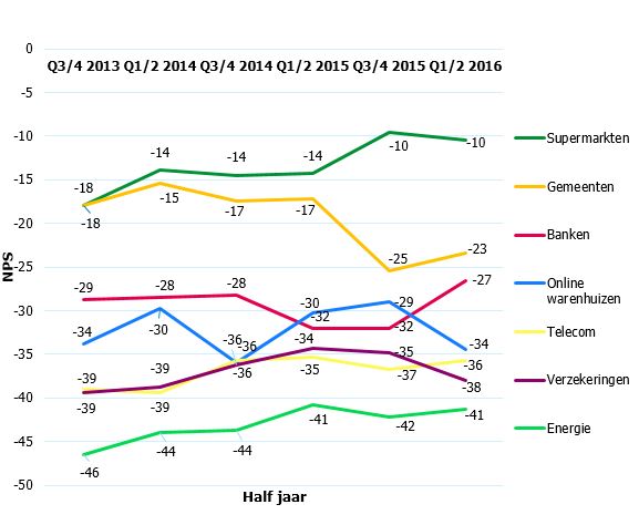 In de afgelopen 3 jaar (tot en met juni 2016) hebben wij onder een representatieve groep consumenten onderzocht in welke mate men bedrijven in 7 verschillende sectoren aanbeveelt. Het is opmerkelijk om te zien dat de gemiddelde NPS gedurende de laatste anderhalf jaar stabiel is, circa -30.