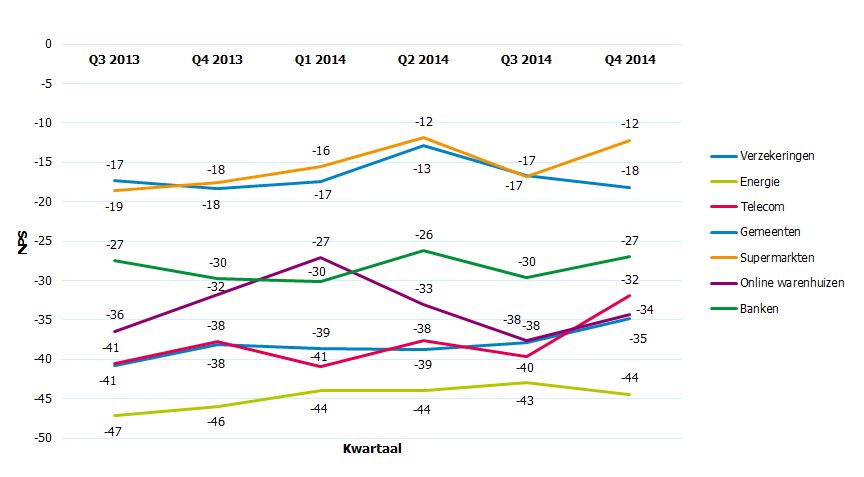 Deze branche bungelt onderaan als het gaat om NPS. Traditioneel voelen klanten niet veel betrokkenheid bij hun energiebedrijf. Energie leveren kan toch iedereen? Tóch kan worden vastgesteld dat er allerlei initiatieven in gang worden gezet om klanten meer centraal te zetten. Ook trekken energieaanbieders hun proposities breder door klanten inzicht te geven in verbruik van energie, zodat men controle kan uitoefenen op de nota. Wellicht verklaart dit de licht opwaartse trend. Voorbeeld van het breder trekken van de kernactiviteit is Eneco met Toon wat nu gekoppeld gaat worden aan ook andere technologieën.