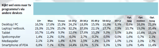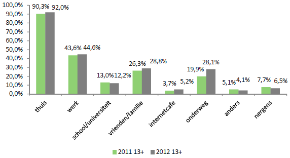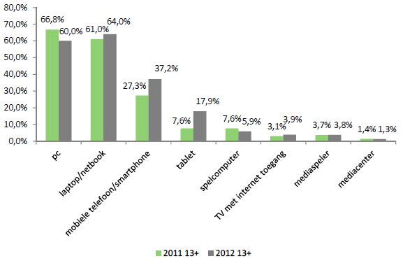 Het gebruik van mobiele devices om te internetten neemt fors toe in 2012. Van alle personen van 13 jaar of ouder geeft 37% aan weleens een smartphone te gebruiken om op te internetten, een groei van 36% ten opzichte van 2011. Ook het gebruik van tablet om te internetten is in een jaar tijd meer dan verdubbeld. In totaal gebruikt 18% van de Nederlandse bevolking van 13+ (weleens) een tablet om te internetten. Dit alles gaat onder meer ten koste van het gebruik van de personal computer (van 67% in 2011 naar 60% in 2012) en van spelcomputers (van 8% in 2011 naar 6% in 2012).