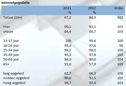 Het aantal mensen dat daadwerkelijk gebruik maakt van internet steeg met 2% naar 12,5 miljoen. De stijging van de internetpopulatie komt vooral voor rekening van vrouwen, ouderen (50+) en laagopgeleiden. Voornoemde groepen zijn duidelijk met een inhaalslag bezig. De penetratie onder jongeren is nagenoeg 100% en ook onder 25-49 jarigen is het internetgebruik vrijwel volledig.