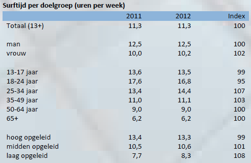 Gemiddeld brengt de internetpopulatie van 13 jaar en ouder iets meer dan 11 uur per week op het internet door. Dat niveau is gelijk aan dat van een jaar eerder. Een sterke stijging van de surftijd is te zien onder met name lager opgeleiden en 25-34 jarigen.