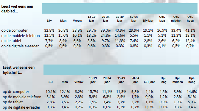 Tabellen van het mediagebruik van video en dagbladen