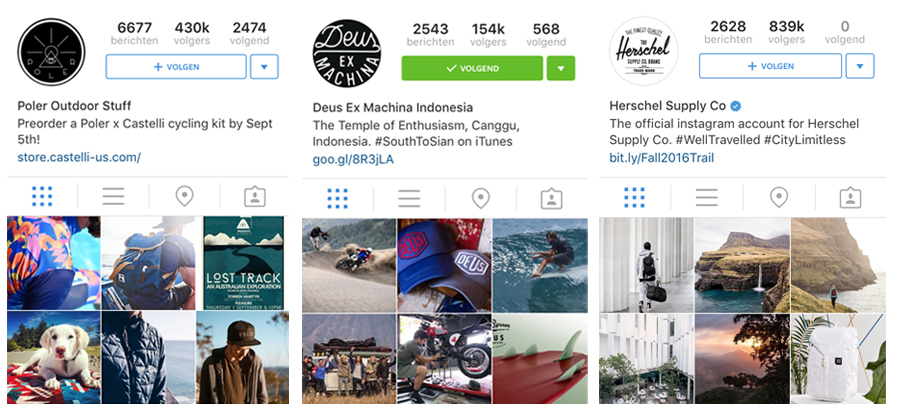 Vele opkomende kleine merken en retailconcepten laten zien dat hun kracht zit in het verhaal en de mensen achter deze ondernemingen. Online kunnen zij, door omstandigheden, relatief eenvoudig een groep gelijkdenkenden bereiken, wat hen in staat stelt snel te groeien. Merken als Poler Outdoor Stuff, Deus Ex Machina en Herschel Supply Co zetten net als de grotere outdoormerken sommige van de hierboven aangedragen punten in, maar creëren bovenal een realistische doch inspirationele wereld.