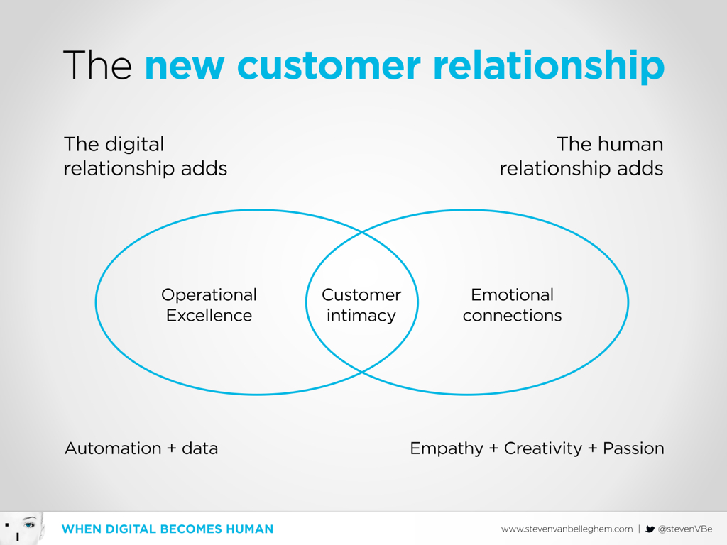 Veel strategiediscussies gebruiken dit schema als de basis voor hun lange termijn strategie. In mijn nieuwe boek ‘When Digital becomes Human’ stel ik dat dit model nog langer opgaat. De moderne klantenrelatie combineert operational excellence met customer intimacy. Daar houdt het niet bij op. Hoe paradoxaal het ook klinkt, door de sterke digitalisering, wordt het menselijke uiteindelijk opnieuw de differentiator. Naast efficiëntie en klantgerichtheid voegen moderne bedrijven een sterke emotionele band toe aan de relatie met de klant.