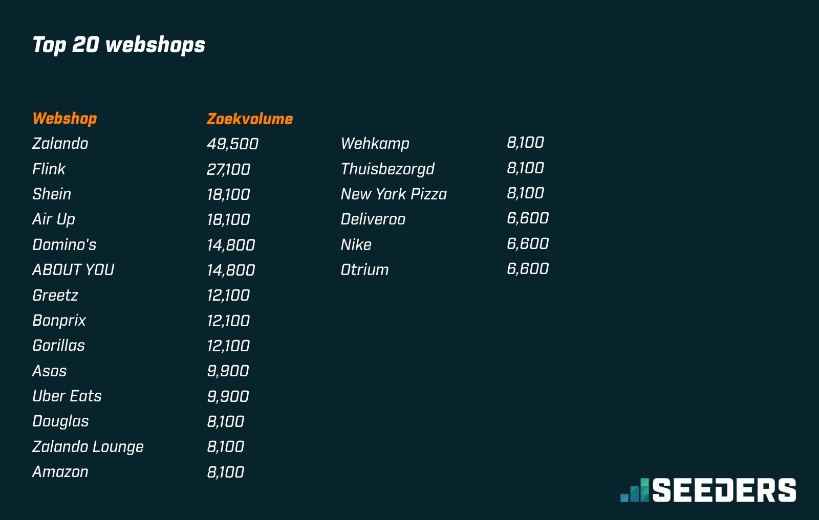 Dat het gezwaai met kortingscodes bepaald geen typisch Nederlands fenomeen is (met dus typische uitzonderingscategorieën), wijst onderstaand rijtje uit. Zoek de eerste Nederlandse home-grown e-retailer. We denken Wehkamp. En die heeft last van… inderdaad de nummer-1. Voor het onderzoek is volgens Seeder een analyse uitgevoerd via Keyword Planner in de periode januari t/m december 2022. Er is gekeken naar de zoekwoorden die qua zoekvolume het hoogst scoren wanneer het woord ‘kortingscode’ werd ingevuld in het zoekveld.