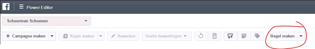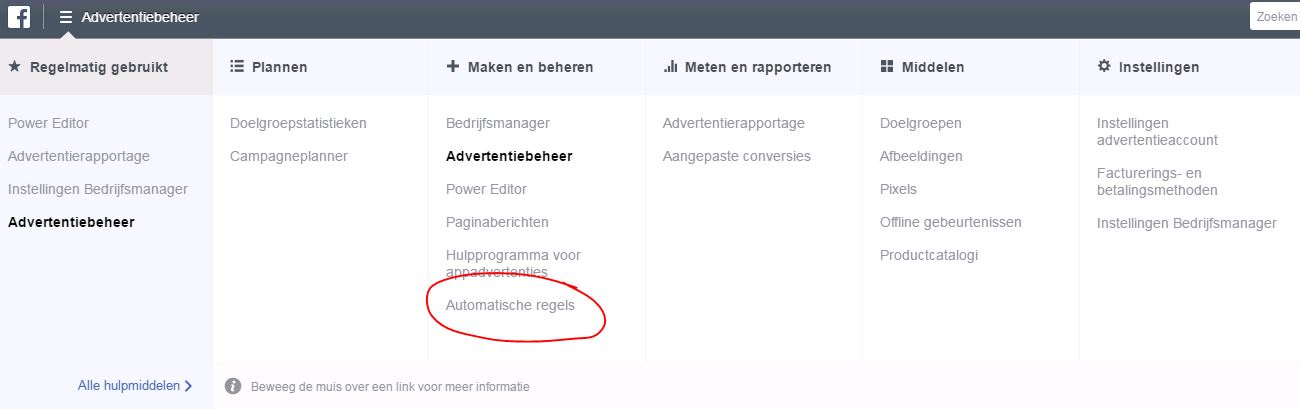 De automatische regels zijn te vinden in zowel het Advertentiebeheer als de Power Editor. De onderstaande afbeeldingen geven weer waar je de optie kan vinden.