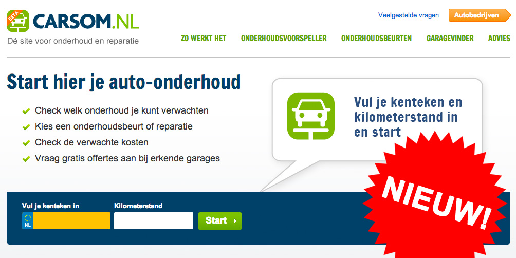 Op de site vinden autobezitters alle onderhoudsbeurten en de top-30 meest voorkomende reparaties voor hun specifieke auto. Denk hierbij aan het vervangen van remschrijven, een distributieriem, etc. Daarnaast biedt Carsom.nl autobezitters inzicht in welke auto-onderhoud ze kunnen verwachten in de komende jaren. Alle informatie die getoond wordt is gebaseerd op de voorschriften van autofabrikanten. Unieke informatie, die voor het eerst voor autobezitters inzichtelijk wordt gemaakt (garages werken al jaren met deze informatie).