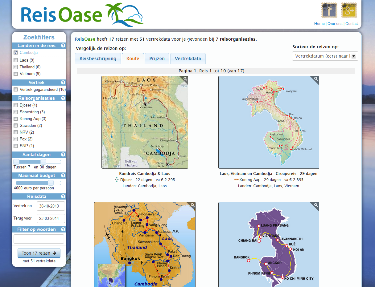 Om toch wat statistieken te noemen: momenteel zijn er 8 aanbieders aangesloten op ReisOase.nl. Alle groepsreizen van Djoser, Shoestring, Koning Aap, Kras, SNP, Sawadee, NRV en Fox Vakanties kunnen tot in detail doorzocht en vergeleken worden. Het aanbod van deze 8 organisaties maakt het mogelijk om groepsreizen in 122 landen te vinden. Het totale aanbod bestaat uit 821 groepsreizen met 6.794 vertrekdata.
