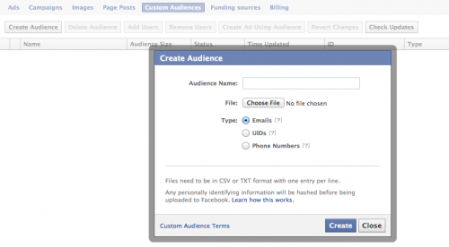 De optie is niet beschikbaar via de Marketplace van Facebook. Het aanmaken van en targeten op een custom audience is alleen mogelijk met de Power Editor van Facebook of API partners, zoals AdParlor en Buddy Media.