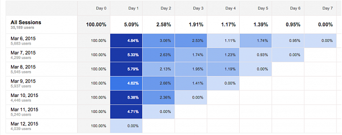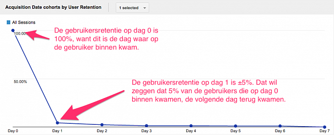 In dit geval is de gebruikersretentie per dag over de laatste 7 dagen geplot. Dag 0 heeft een retentie van 100 procent, aangezien dit de dag is waarop de bezoeker voor het eerst de site bezocht. Dag 1 heeft een retentie van ongeveer 5 procent wat dus wilt zeggen dat gemiddeld genomen over de laatste 7 dagen, 5 procent van de bezoekers een dag na het initiële bezoek terug kwam op de website.