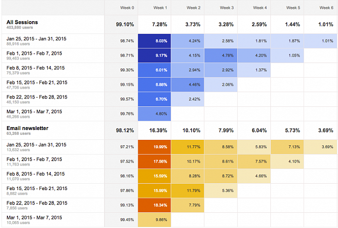 Zo zou je bijvoorbeeld kunnen onderzoeken waarom een bepaald cohort (bijvoorbeeld van een bepaalde week) voor een hogere gebruikersretentie zorgt. Om dit te doen, is de eerste logische stap om te zetten het verkeer op te splitsen naar herkomst. Als voorbeeld heb ik hier onder het verkeer vanuit de e-mailnieuwsbrief gesegmenteerd.