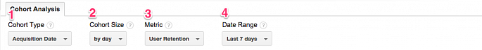 De grootte van het cohort is in te stellen op dag, week en maand. De selectie die je hier maakt, heeft ook invloed op selector nummer 4: date range. Voor ons eerder genoemde voorbeeld met de actiecode die een week geldig is, zou de selectie op weekniveau logisch zijn.