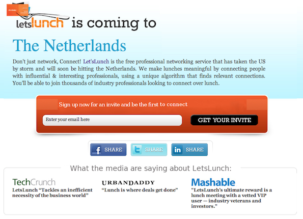 Het sociaal netwerk is in februari dit jaar opgericht door een programmeur uit Silicon Valley en telt inmiddels ruim 12.000 ‘letslunchers’. De introductie van het netwerk in Nieuw Zeeland en Italië is door de media zeer positief ontvangen. De UK en binnenkort andere Europese landen volgen. In Nederland wordt de website gelanceerd nadat 500 e-mailadressen verzameld zijn van de professionals die graag na de lancering direct Letslunch.com uit willen proberen. Vaak zijn dat de ‘innovators’ c.q. ‘early adopters’ die fundamenteel gecommitteerd zijn aan nieuwe technologieën omdat zij geloven dat deze vroeg of laat hun levens zal verbeteren. Zij adopteren de innovaties graag en verwachten dat het gebruik daarvan hun in de toekomst een concurrentievoordeel gaat opleveren. Onder deze enthousiastelingen verloten wij maar liefst 50 advertenties.